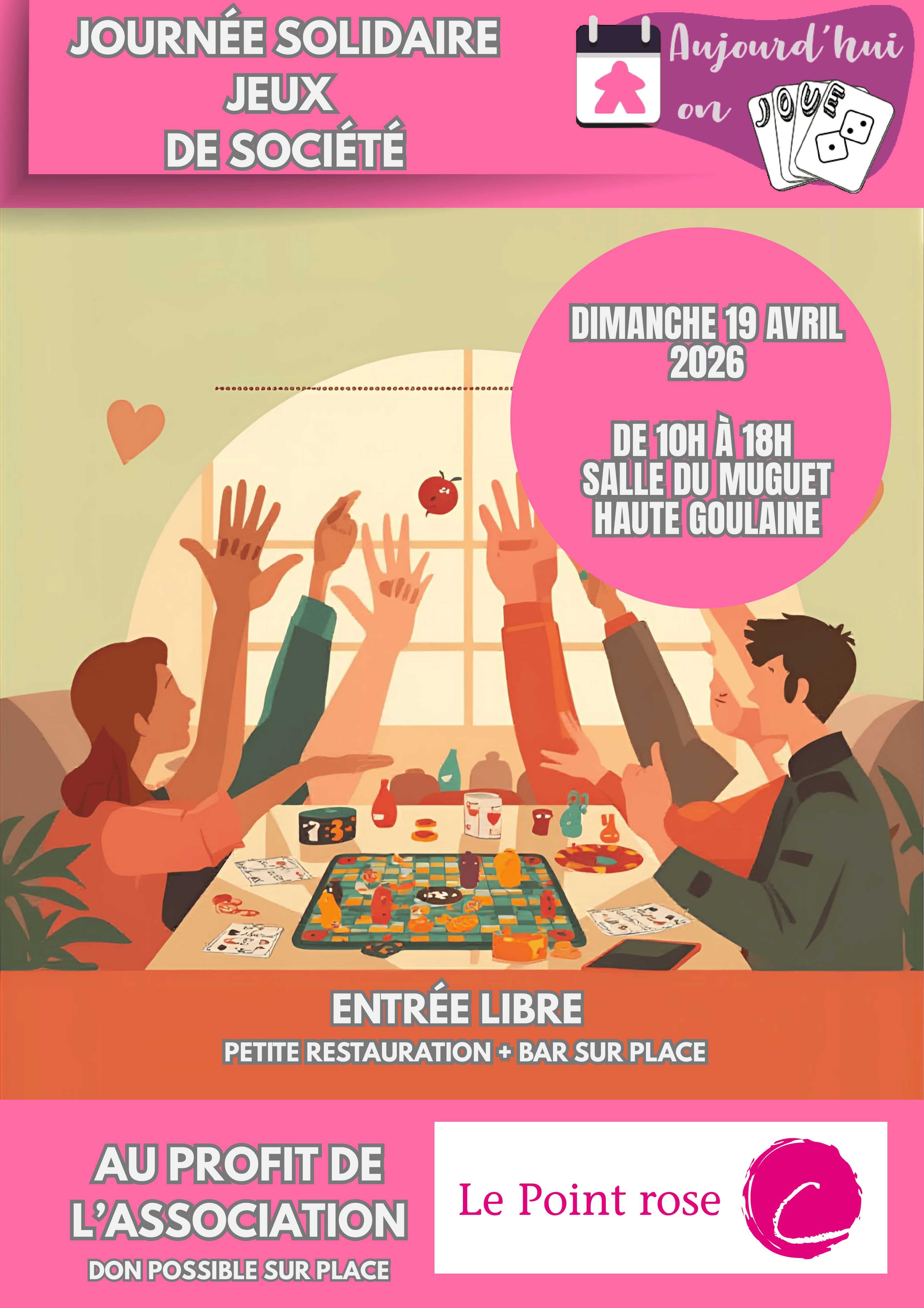 L'association Aujourd'hui On Joue organise une journée ludique où chacun pourra s'adonner à ses jeux de société préférés ou en découvrir de nouveaux. Les recettes seront reversées au Point Rose, association caritative qui accompagne les personnes confrontées à la fin de vie d’un enfant.