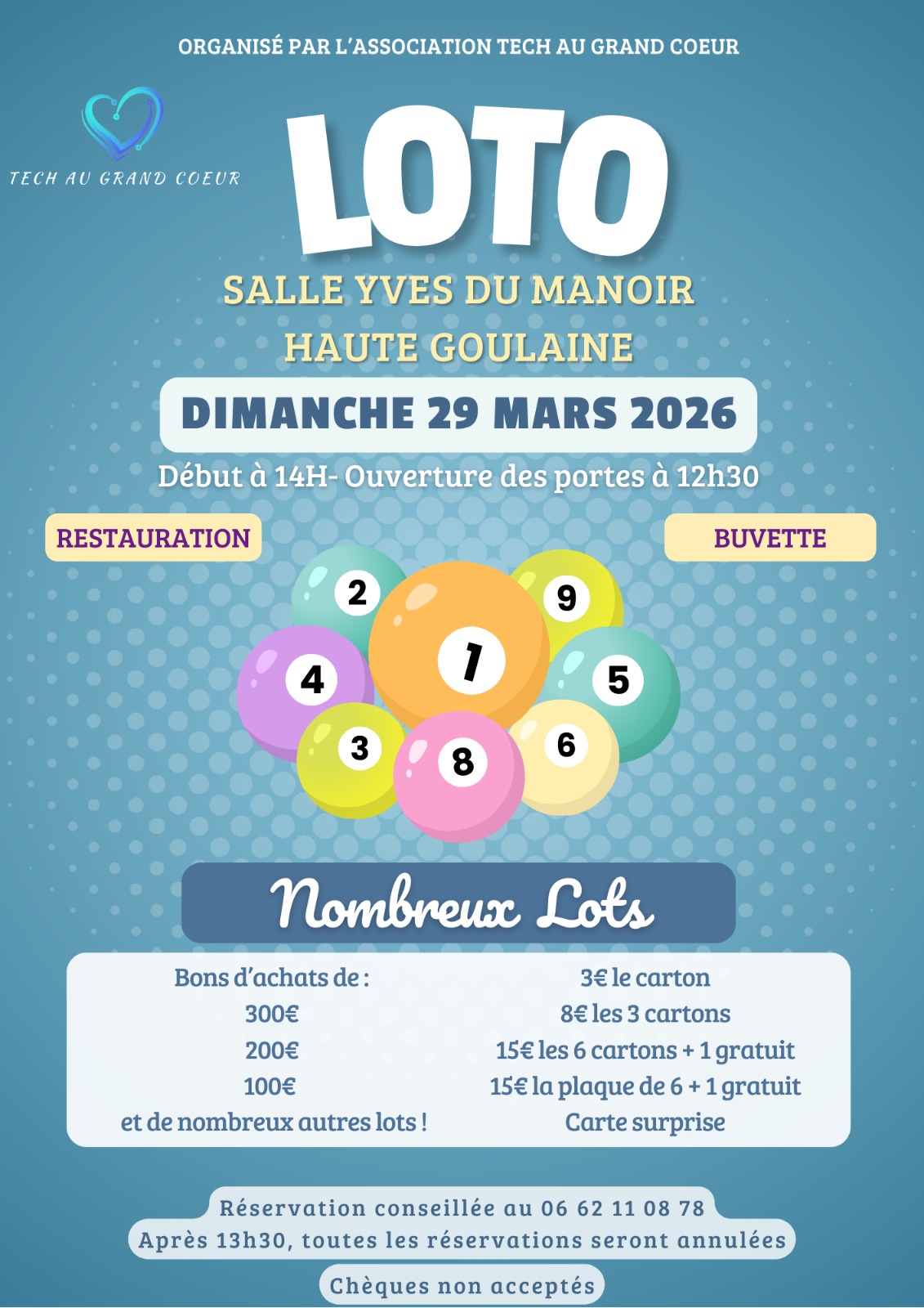 Tarifs | 3 € le carton, 8 € les 3 cartons, 15 € les 7 cartons, carte surprise (chèques non acceptés)